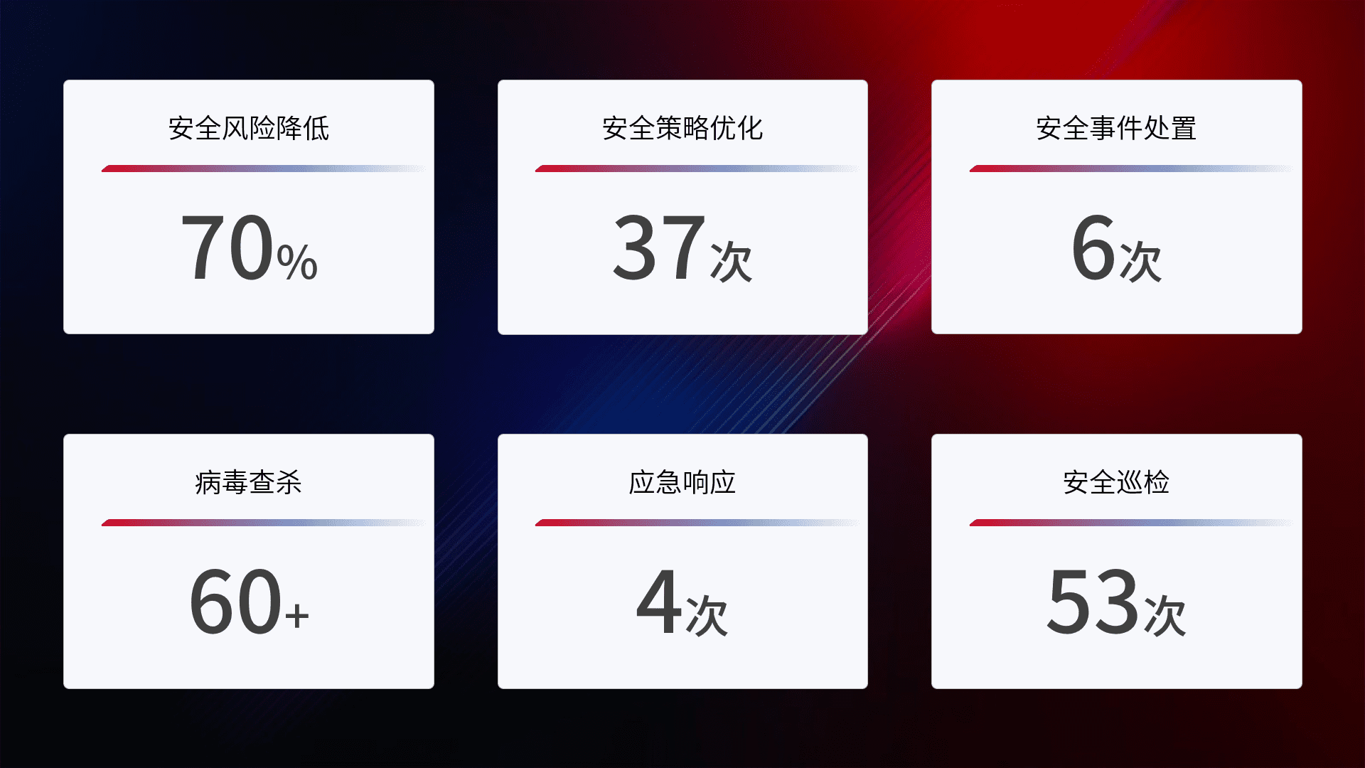 提供全面的安全事件报告体系,,,包括处置报告、、、周报、、、季度和年度总结,,结合持续监控,,,帮助客户深入了解网络安全状况。。。。